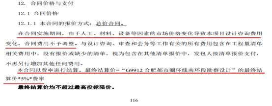 最终结算价=“G9912合肥都市圈环线南环段勘察设计”(招标编号:2022BFABZ02814)的最终结算价*5%*费率最终结算价不超过本项目最高投标限价(910万元)