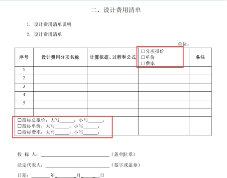 11.招标文件约定 “本次招标采用综合评分法(定价),固定费率45%。”,投标文件格式报价文件中设计费用清单如下截图: