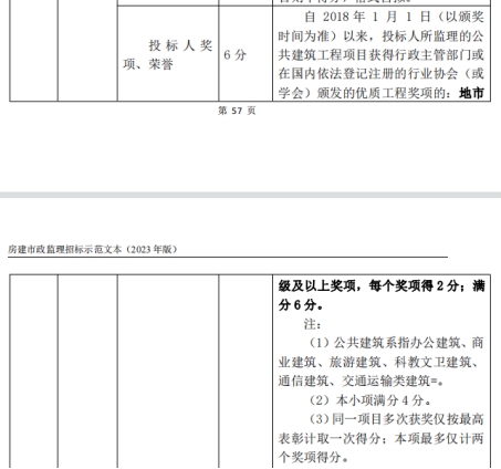 自 2018年 1 月 1 日(以颁奖时间为准)以来,投标人所监理的公共建筑工程项目获得行政主管部门或在国内依法登记注册的行业协会(或学会)颁发的优质工程奖项的:地市级及以上奖项,每个奖项得2分;满分6分。