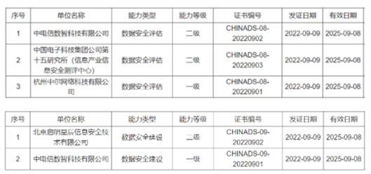经调研,同时具备数据安全建设能力证书、数据安全评估能力证书的企业仅有中电信数智科技有限公司一家可满足。