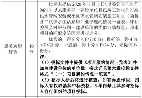 建议修改为“投标人提供 2020 年 1 月 1 日(以签订合同时间为准)以来已竣工验收的市政供水管网安装或小区供水管网安装施工项目(须包含二次供水生活泵房)业绩履约情况一览表。评标委员会对类似业绩数量、与本项目的匹配度等因素进行评分:优秀的,得 8 分<F≤10 分;良好的,得 4 分<F≤8 分;一般的,得 1 分<F≤4 分;未提供不得分。注:(1)投标文件中提供《项目履约情况一览表》及一览表中所填项目合同协议书及竣工验收证明文件,格式详见第六章投标文件格式“(一)项目履约情况一览表”。(2)招标人标后将进行核查,如有弄虚作假,招标人有权取消其中标资格,3 年内禁止其参与招标人自行组织的项目投标。”