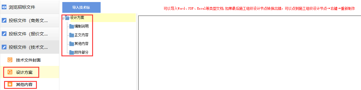 (3)投标文件制作软件中技术文件可以导入的节点如下图,请问演示文件是否在“设计方案”节点导入吗?