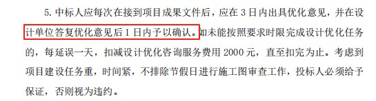 答:将招标文件第三章第七条第5点及第五章合同第七条中的乙方责任第7)项修改为:“中标人每次在接到项目成果文件后,应在3日内出具优化意见,并在设计单位答复优化意见后1日内予以确认;如有争议优化点需要讨论确认时,可与招标人另行协商确认时间。如未能按照要求时限完成设计优化任务的,每延误一天,扣减设计优化服务费用2000元,直至扣完为止。考虑到项目建设任务重,时间紧,不排除节假日进行设计优化工作,乙方必须给予保证,否则视为违约。”