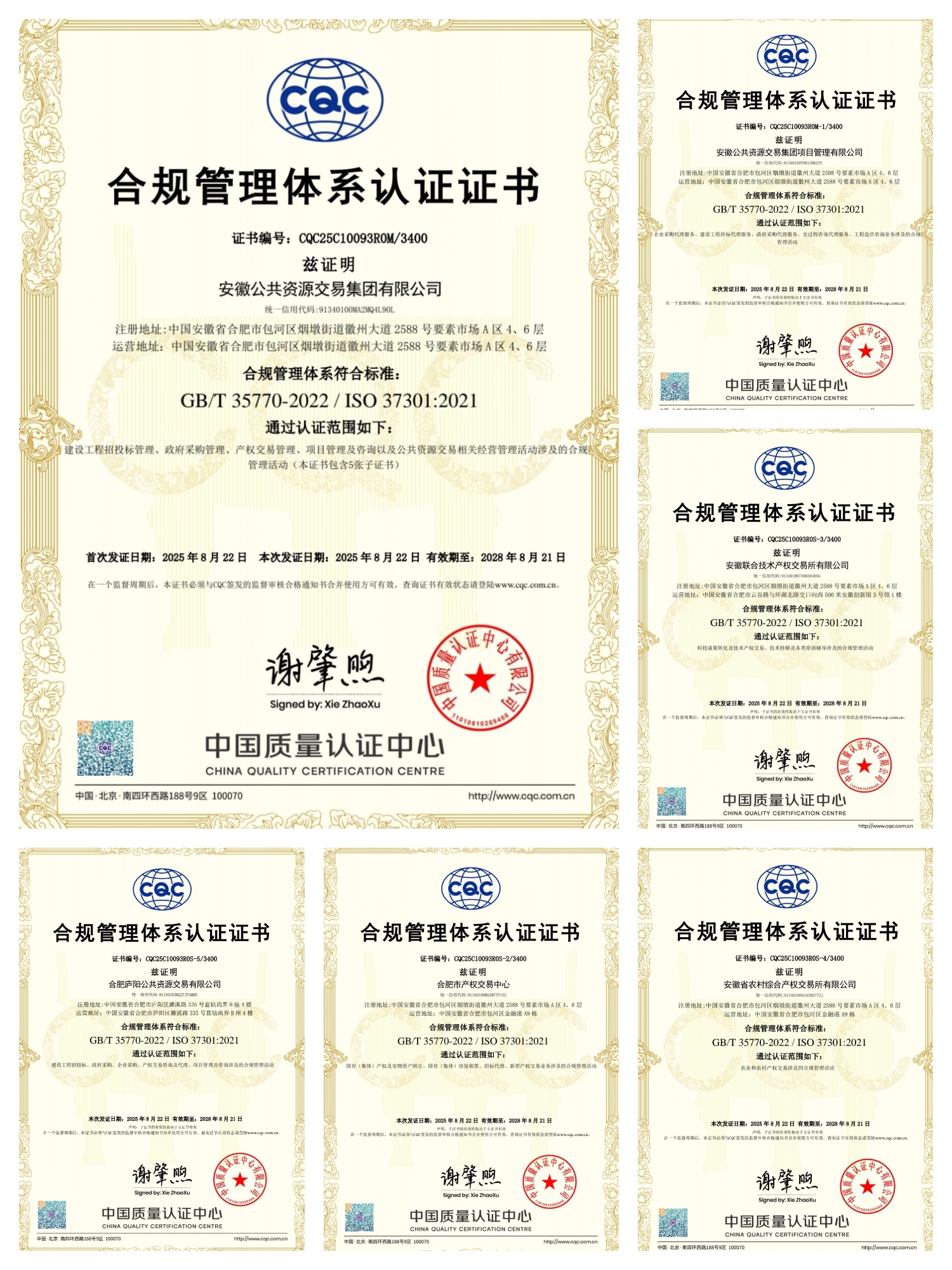 8月22日,安徽公共资源交易集团有限公司(以下简称“安徽交易集团”)及其五家全资(控股)子公司顺利通过GB/T35770-2022/ISO37301:2021国际国内双认证,荣获合规管理体系认证证书。