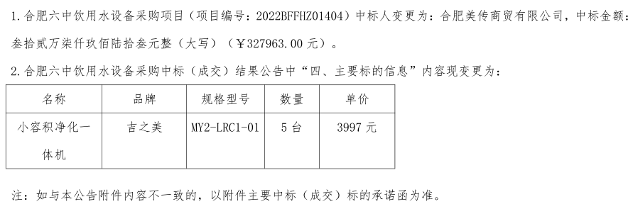 合肥六中饮用水设备采购项目中标通知书已发出,请中标(成交)供应商登录电子交易系统自行下载领取电子中标(成交)通知书。