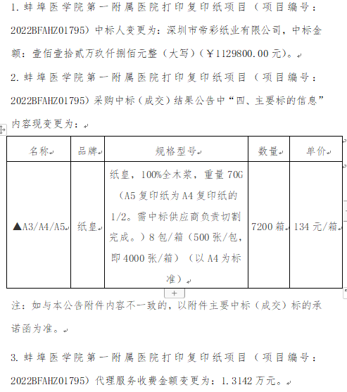 蚌埠医学院第一附属医院打印复印纸项目中标通知书已发出,请中标(成交)供应商登录电子交易系统自行下载电子中标(成交)通知书。